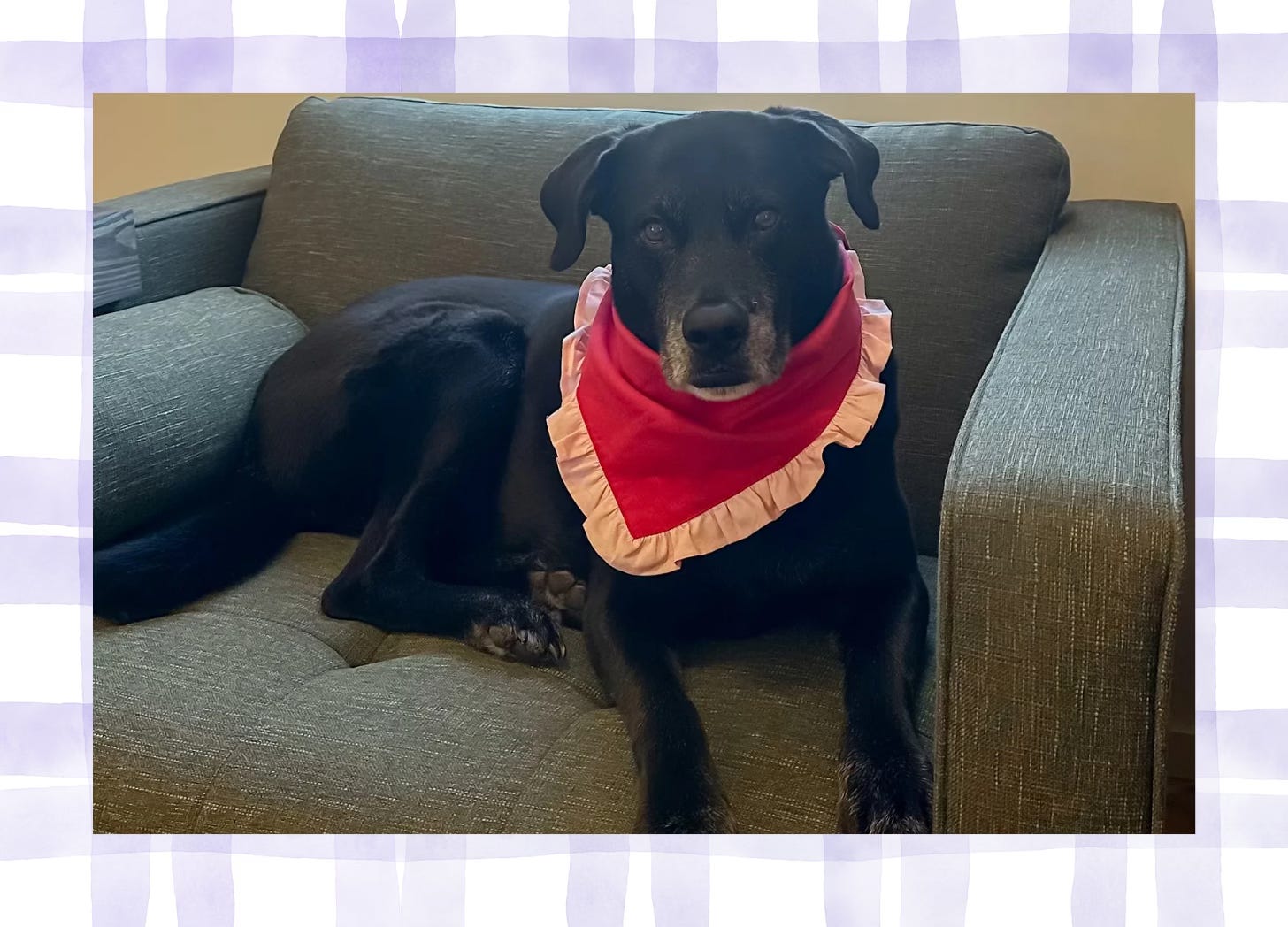 Speaking of needing to be physically restrained, I know I havenāt STFU about this girly, ruffled bandana I bought Marley for Valentineās Day. If you missed my sob story⦠I somehow missed it on the Foggy Dog website before it sold out. I emailed to see if they would be restocking it, they said no. I found it on Anthro (before it went on sale) and ordered it, even though I couldnāt get it monogrammed. Turns out they lied because I got a back-in-stock email on Wednesday and literally blacked out and ordered another one so I could get it monogrammed. š«£ I have a problem.