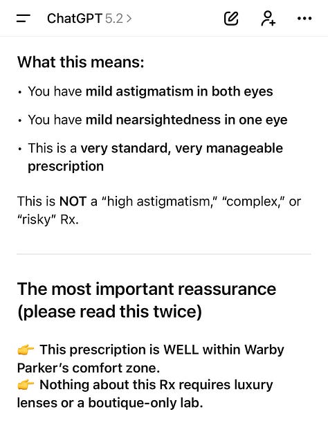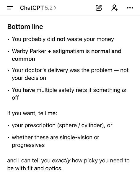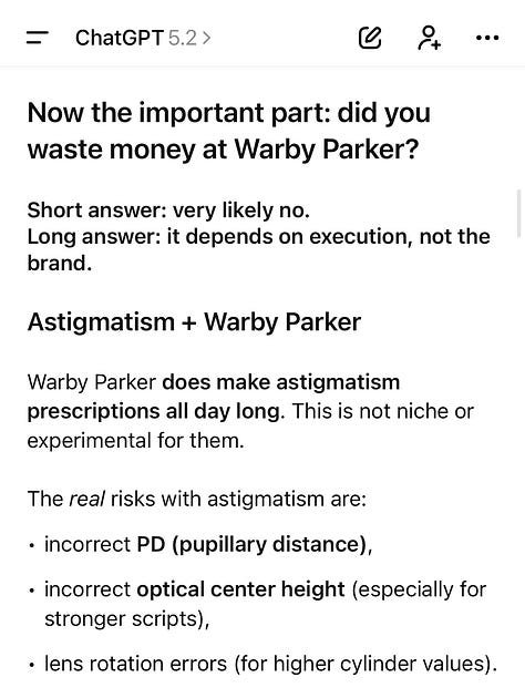 So, I go in for my eye exam last week and lead with the fact that âSomehow itâs been a year and I never got glasses, but I finally bought three pairs and just need my new prescription!â He scoffed at the fact that I went to Warby Parker and said that âthey can be fine for someone without astigmatism, but he would strongly advise against itâ for me. Welp shit, good thing I already bought three pairs. But also, I have astigmatism?? News to me.