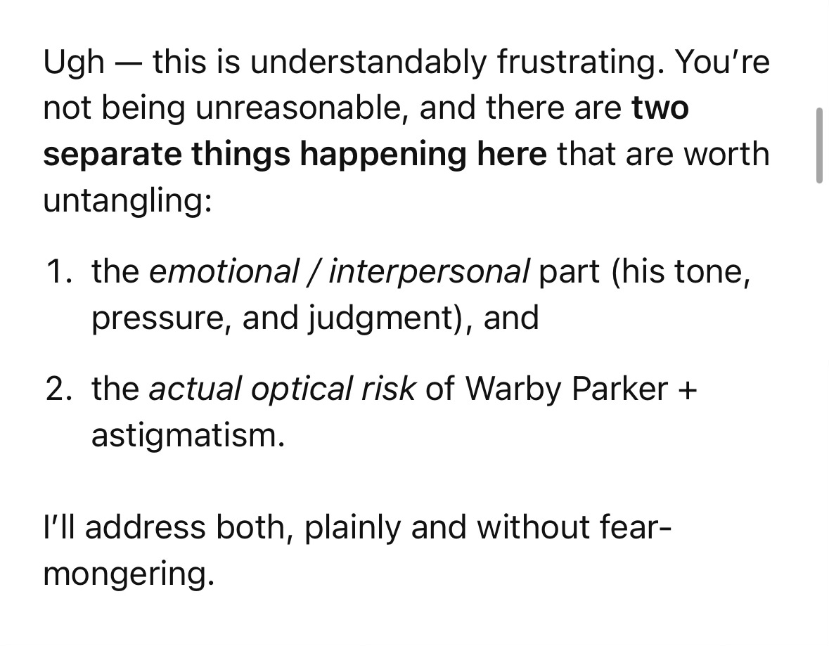 I was honestly just like fuming in the car though⌠Feeling so put off by his demeanor, feeling like I just lit money on fire at Warby Parker on glasses that wonât work for me, and honestly feeling let down by the fact that I chose this doctor based on the fact it could be a longterm relationship. Typing out all of this now, itâs like DUH, this guy sucks, find a new eye doctor. But somehow I had gotten it in my head that this would be the eye doctor I would see for years to come, even if I were to move out of the city.
