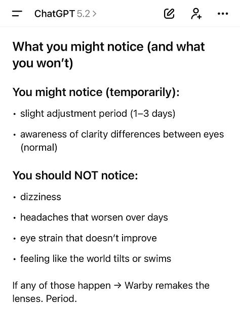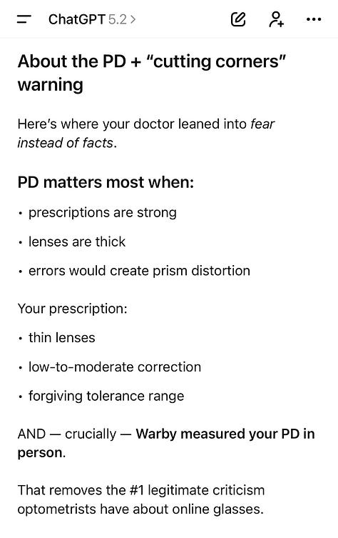 Iâm already scoffing at your optometristâs statements. Iâve been going to Warby Parker for 7+ years for both eye exams and glasses and have never had an issue with their products despite needing both a high prescription AND having astigmatism. This man sounds like he is prioritizing being a salesman over being a provider. Also, canât recommend contacts enough đ I will only wear my glasses if I have no other choice!
