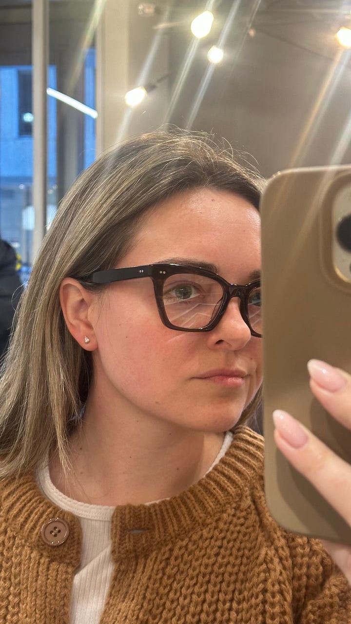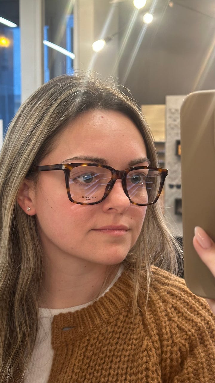 I got the conversation back to my eyesight and if I âneededâ glasses, to which the response was just âWell, would you like to see better?â Trying on glasses in his office after the appointment didnât go well⌠I didnât have makeup on (because I was getting my eyes checked), bad lighting, and it was the middle of January and the winter uglies were definitely out in full force. I took a picture of a few pairs that were my best options, which I later showed to my girlfriend and I believe I got an, âoh my gosh, NO.â Not to mention, every single pair was designer: Tom Ford, Oliver Peoples, Saint Laurent, Gucci, etc. So every pair of glasses that I didnât even like would be at least $500 with lenses, and that was after the $200 credit provided by my insurance. Cool, cool, cool.